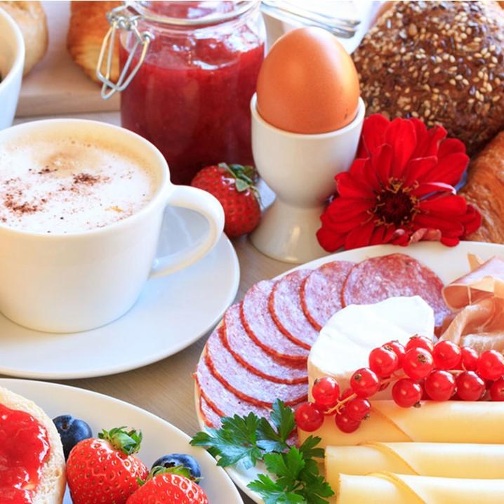 Leckeres Frühstücksbuffet mit Brötchen l Aufschnitt l süßem Aufstrich l gekochten Eiern l Obst